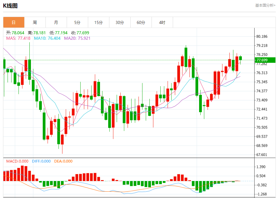 原油市场:截止北京时间21:21,美油下跌,现报77.700,跌幅0.33%。纽市盘前,原油价格现在面临着测试看涨通道支撑线的负面压力,这促使人们在即将到来的交易中保持谨慎,因为价格需要在这一支撑上方盘整-现在位于77.05-以保持今天的看涨趋势,因为突破这一支撑将推动价格实现看跌修正,其下一个目标达到75.35,而价格需要突破77.86才能恢复近期目标为80.00区域的积极情景。