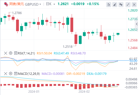 欧元:截止发稿,欧元/美元徘徊于1.0787近。欧元/美元上周五上涨,收报1.0774,涨幅0.02%。本周采购经理人指数(PMI)数据公布之前,欧元(EUR)的经济数据疲软,而美国数据在美国生产者价格指数(PPI)上升而不是周五下降后几乎没有给交易员带来什么可咀嚼的。周一,美国市场将因总统日假期而陷入黑暗,交易员将等待周三的美联储会议纪要,以寻找有关美联储距离降息有多近(或多远)的暗示。技术面上,汇价上行的初步阻力位于1.0796,进一步阻力位于1.0821,关键阻力位于1.0857;汇价下行的初步支撑位于1.0735,进一步支撑位于1.0698,更关键支撑位于1.0673。
