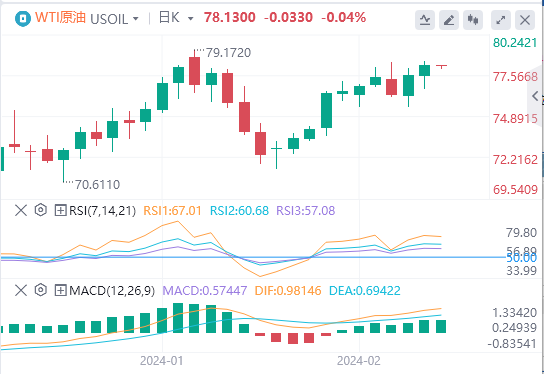 周一亚盘,原油交投于78.13附近。原油上周五延续了近期的反弹势头,回升至78.00美元关口,上周五收盘前回到了一个值得关注的技术区域。以色列和巴勒斯坦哈马斯之间的加沙冲突仍未得到解决,谈判激烈的停火协议也未取得重大进展,这使能源市场对紧张局势外溢到伊朗等原油生产大国感到紧张。也门胡塞叛军继续在红海袭击驶往苏伊士运河的民用货船,加剧了市场对可能出现原油供应中断的担忧。