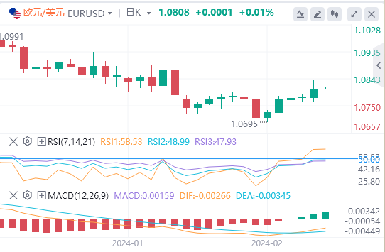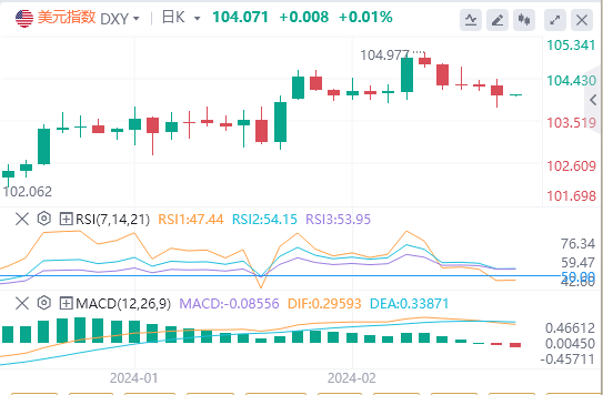 美元指数:截止发稿,美元指数交投于104.07附近。尽管节后出现下跌,但在经济有弹性和看似不可动摇的美联储(美联储)中,美元的立场仍然坚定,美联储不愿诉诸货币宽松政策,最终可能会限制美元的跌幅。技术面上,日线图指标反映了当前技术格局的有些矛盾。尽管相RSI处于正值区域,但其负斜率表明看涨势头减弱,暗示存在潜在的下行风险。同时,MACD直方图中的绿色条正在减少,表明购买压力放缓和情绪的潜在转变。