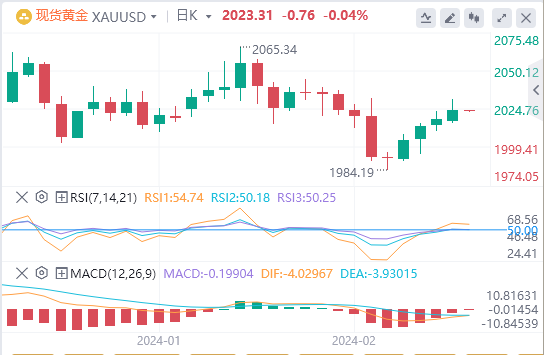 周三亚盘,黄金交投于2023.31附近。现货黄金周二延续升势,连续第四天上涨。金价交投于愈一周高位2030美元附近。越来越多的投资者猜测美联储(Fed)将在更长时间内维持较高水平利率,美元受到影响,正如官员们所预期的那样。在有迹象表明美国经济具有活力的情况下,投资者押注美联储将降息,但决策者从未停止对这种押注的警告。芝加哥商品交易所美联储观察工具显示,市场参与者正押注美联储将于6月降息。3月份降息25个基点的概率已降至34.4%,而6月份降息的概率则升至55.1%。