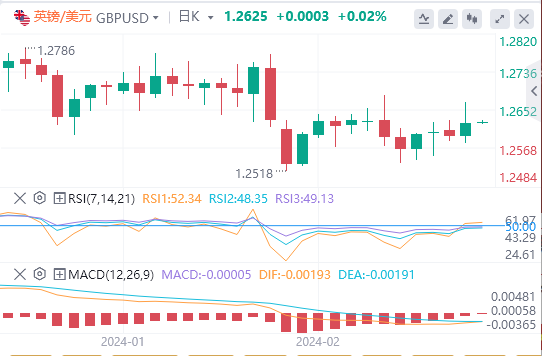 英镑:截止发稿,英镑/美元徘徊于1.2625附近。英镑/美元周二上涨,收报1.2622,涨幅0.21%。周二英央行行长贝利就通胀和经济前景作证。贝利表示,他同意投资者押注今年降息,但贝利指出,有迹象表明英国经济在2023年底陷入衰退后正出现复苏。他还指出,在降息之前,通胀水平不需要低于2%,预计今年降息并非不切实际,但他没有提供准确的时间点。技术面上,汇价上行的初步阻力位于1.2668,进一步阻力位于1.2713,关键阻力位于1.2758;汇价下行的初步支撑位于1.2578,进一步支撑位于1.2533,更关键支撑位于1.2488。