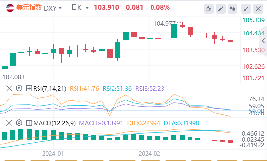 美元指数:截止发稿,美元指数交投于103.91附近。在强劲数据的支持下,美国经济显示出韧性,这反映在2024年美元的强势上。与此同时,美联储(Fed)保持鹰派立场,对近期降息不屑一顾,并热衷于将利率维持在限制性水平。市场逐渐与这一观点保持一致,强化了对宽松周期延迟的预期。技术面上,日线图上的指标反映了买入和卖出压力之间的平衡。RSI处于正值区域,但其负斜率表明购买势头正在失去动力。MACD及其绿色柱线的减少意味着任何看涨势头都在减弱,并可能转变为看跌偏见。此外,该指数与SMA的定位提供了一个有趣的视角。尽管存在看跌压力,但多头仍设法将美元指数保持在 20 日和 200 日均线上方。这表明买家在更广泛的时间范围内继续发挥一些力量。