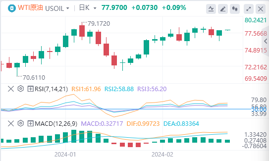 周四亚盘,原油交投于77.97附近。WTI价格小幅走高,因美联储官员表示利率可能已达到峰值,中东地缘政治紧张局势升级继续影响原油供应。根据联邦公开市场委员会(FOMC)1月会议纪要,美联储官员同意美国利率可能已经见顶,同时补充说,在他们对通胀可持续地回到央行目标更有信心之前,不应降息。投资者预计首次降息将在6月的会议上进行,而不是在3月或5月的会议上。值得注意的是,较低的利率通常会刺激经济增长,从而提振对WTI的需求。数据显示,美国石油协会(API)周三发布的数据显示,截至2月16日当周,美国原油库存较前一周的852万桶增加716.8万桶。