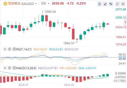 周一亚盘,黄金交投于2030.98附近。周一亚市早盘,黄金处于负值区域。然而,围绕美联储(Fed)利率的不确定性可能会在周四核心个人消费支出价格指数(CoreCPI)公布之前提振黄金。最近几周强于预期的美国通胀数据引发了市场对推迟降息的预期。上周,美联储理事克里斯托弗·沃勒(ChristopherWaller)表示,美联储官员并不急于实施降息。投资者预计美国可能要到6月才会降息。这将远远超过此前对3月减产的预期。交易员现在预计从6月开始的首次降息,美联储的最新指引显示今年将降息三次。
