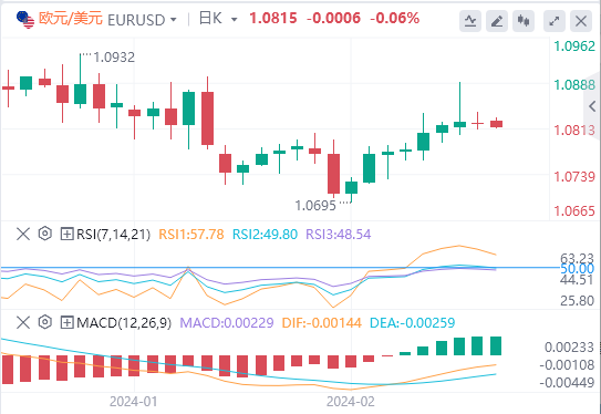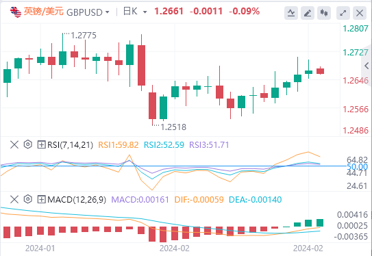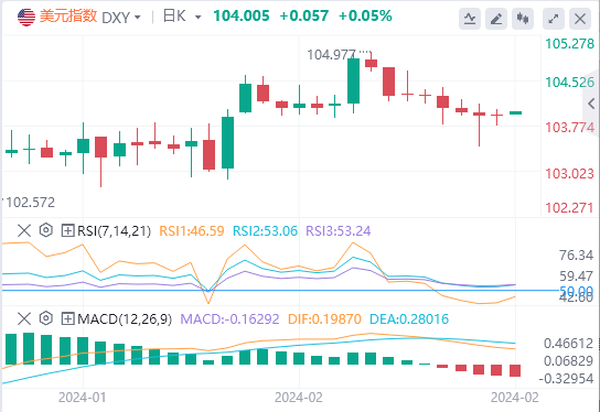 美元指数:截止发稿,美元指数交投于104附近。美元小幅波动,因为市场正在为本周公布的1月份个人消费支出(PCE)数据做准备,为周五的交易定下了平静的基调。市场预期显示,正如CME FedWatch Too所表明的那样,短期内降息的可能性降低,3月或5月降息的可能性较低。强劲的美国国内经济和有弹性的劳动力市场有助于维持美联储目前的立场,将宽松政策推迟到6月。技术面上,日线图上的指标反映了喜忧参半的情绪,买入和卖出力量都在争夺主导地位。一方面,RSI虽然持平,但处于正值区域,暗示潜在的看涨力量。美元指数在20天和200天SMA上方的定位支持了这种看涨情绪,凸显了买家在长期内的弹性。
