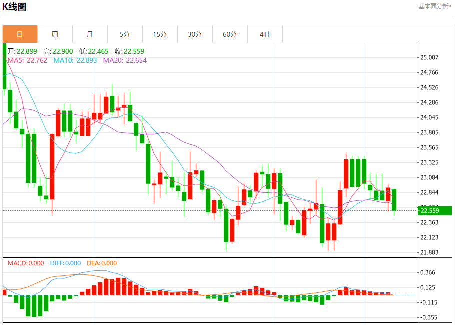 现货白银:截止北京时间21:28,现货白银下跌,现报22.558,跌幅1.58%。纽市盘前,白银价格显示出新的负面交易,以支持今天预期的看跌趋势的延续,这是由随机的当前负面因素推动的,等待测试22.25作为下一个主要目标。