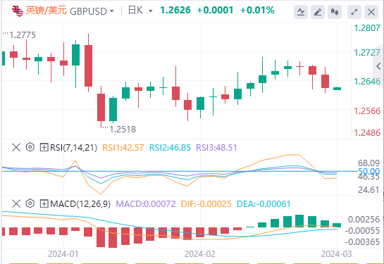 欧元:截止发稿,欧元/美元徘徊于1.0812近。欧元/美元周四下跌,收报1.0804,跌幅0.31%。周五将公布2月份泛欧消费者物价调和指数(HICP)通胀,2月份的美国ISM制造业指数将结束本周交易。预计截至2月的一年中,欧洲HICP通胀率将走低,美国ISM制造业采购经理人指数预计将略有回升,但仍处于收缩区域。技术面上,汇价上行的初步阻力位于1.0842,进一步阻力位于1.0879,关键阻力位于1.0902;汇价下行的初步支撑位于1.0782,进一步支撑位于1.0759,更关键支撑位于1.0722。