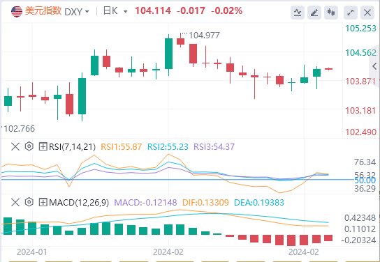 美元指数:截止发稿,美元指数交投于104.11附近。只要美国没有拿出通胀下降的确凿证据,美联储就不会急于降息。此外,市场与央行的预测一致,目前预计从6月开始,2024年将宽松75个基点。技术面上,日线图上的指标反映了买盘势头的积极转变。最初,RSI呈现正斜率,处于正区域表明看涨趋势加强。然而,MACD显示平坦的红色条形图,暗示潜在的看跌压力,抛售活动可能占上风,但不一定会导致趋势转变。在更广泛的技术格局中,尽管潜在的看跌压力将该货币对推低至20日SMA下方,但高于100天和200日均线的定位表明买家在这场博弈中仍然占据上风。