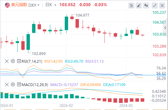 美元指数:截止发稿,美元指数交投于103.852附近。美国经济"软着陆"的可能性越来越大,这使得美联储决策者在其评论中保持了鹰派基调,为6月份甚至比6月份更晚的降息敞开了大门。技术面上,在日线图上,美元指数的2024年高点位于105.00附近(2月14日),是第一个阻力区域。过了这一区域,前面还有一个小障碍,即周线高点106.00(11月10日),其次是11月份的顶部107.11(11月1日)。