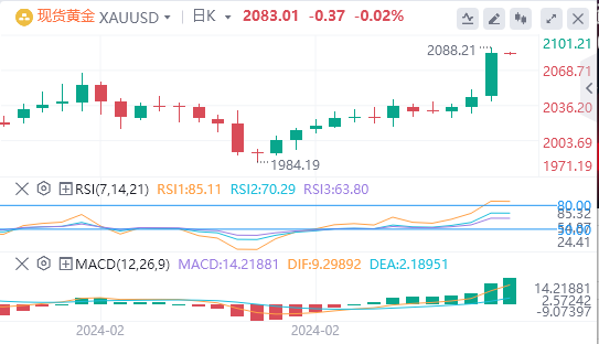 周一亚盘,黄金交投于2083.01附近。周五美国经济数据不乐观,引发了市场对今年晚些时候降息的猜测。此外,美国国债收益率下降也推动了投资者对黄金需求的上升。美国供应管理协会(ISM)周五公布的数据显示,2月份美国制造业采购经理人指数(PMI)从前值49.1降至47.8。该数据已是连续第16个月低于50,表明制造业出现萎缩。