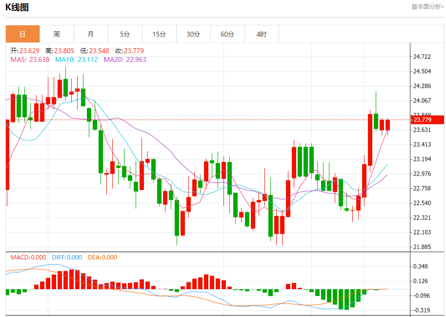 现货白银:截止北京时间21:27,现货白银上涨,现报23.778,涨幅0.57%。纽市盘前,白银价格稳定在23.70水平以下,以保持今天的看跌趋势,其下一个主要目标位于23.00。
