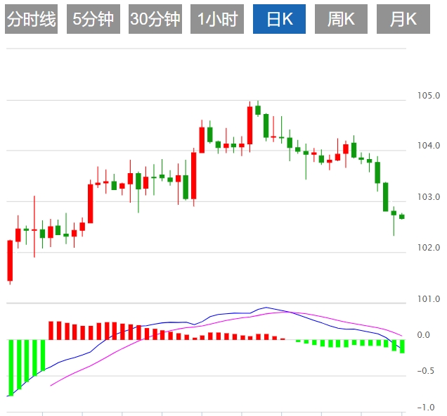 美元指数:截止发稿,美元指数走低,现报102.66。尽管2月份非农就业人数 (NFP) 报告显示美国失业率上升,而收益略有放缓,但市场仍押注宽松周期将在6月开始。在下一个交易日,由于投资者担心经济放缓,美元可能会遭受更多损失。尽管相对强弱指数(RSI)接近超卖状态,但美元指数的前景主要是看跌的。RSI 在 30 附近的位置通常预示着价格反转的可能性。随着移动平均收敛散度 (MACD) 呈现上升的红色柱线,目前的动能指向空头。