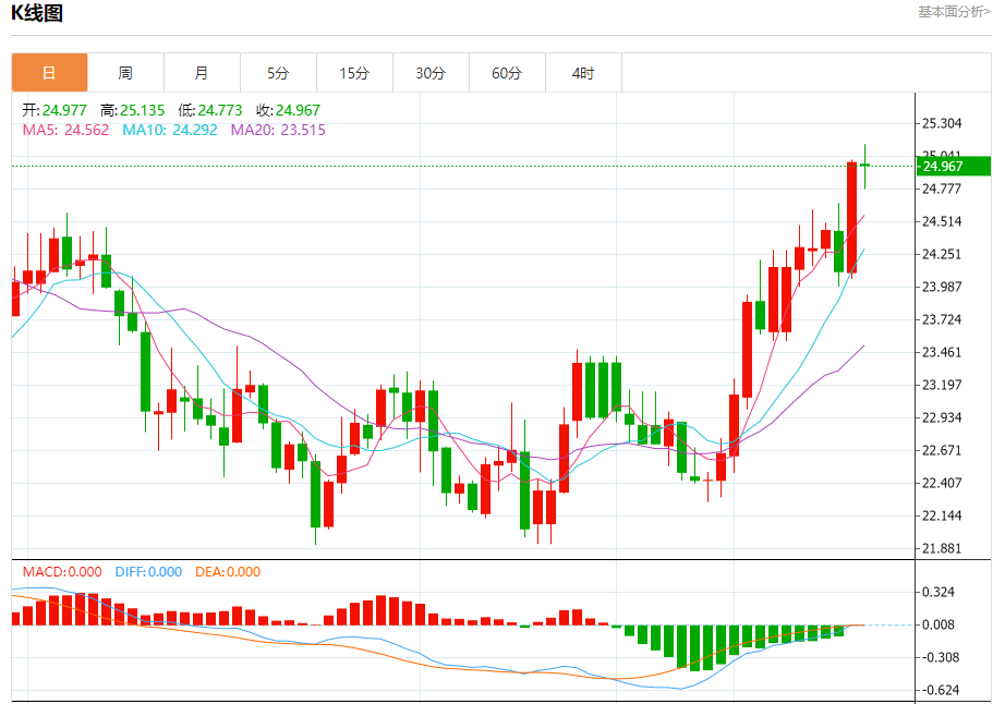 现货白银:截止北京时间21:20,现货白银下跌,现报24.977,跌幅0.07%。纽市盘前,白银价格面临暂时的负面压力,目前试图回升,以保持整体看涨趋势活跃,其下一个目标位于25.50。