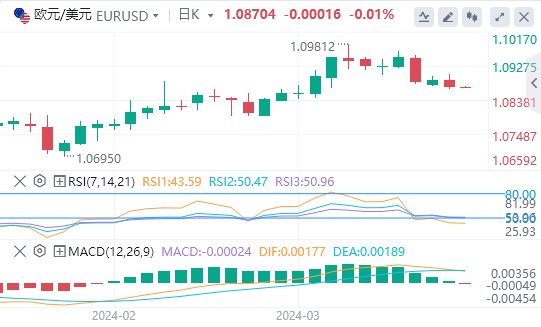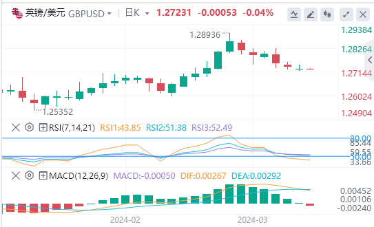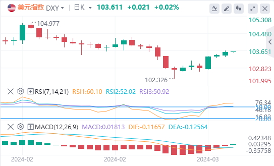 美元指数:截止发稿,美元指数交投于103.611附近。美国经济正处于关键时刻,因为通胀仍然具有粘性,而疲软的劳动力市场数据似乎正在平衡投资者对美联储开始宽松周期时机的预期。就目前而言,第一次减产将在6月进行。技术面上,就目前的技术前景而言,美元指数的动能似乎正在转向有利于多头。相对强弱指数(RSI)跃升至50以上,而移动平均收敛散度(MACD)呈现出递减的红色条形,显示出下降的负动能。