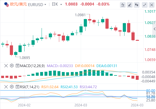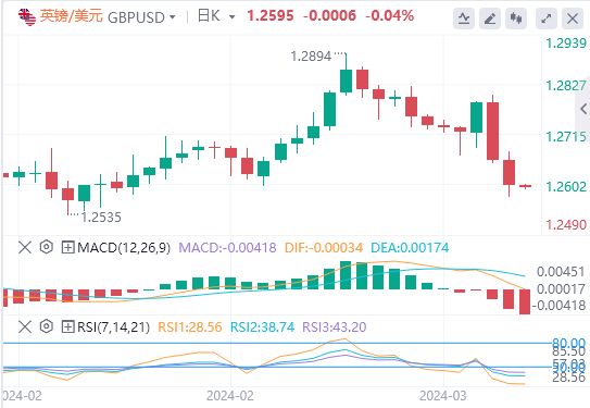 欧元:截止发稿,欧元/美元徘徊于1.0803附近。欧元/美元上周五下跌,收报1.0807,跌幅0.49%。欧元区经济数据不及预期,加剧了欧元的疲软。周中,汉堡商业银行(HCOB)发布的生产者经理人指数(PMI)估计显示,3月份经济下滑略有缓解,但经济仍处于收缩区间。欧盟的数据显示,服务业产出下滑,制造业指数略有改善,因此欧盟综合采购经理人指数为 49.9,高于前值 49.2,略低于临界水平 50 。技术面上,日线图上的技术指标支持再次走低,因为技术指标越过中线进入消极区域,保持坚定的看跌倾向。同时欧元/美元处在所有均线下方,移动均线已失去看涨斜率。200简单移动均线与上述 50%斐波那契回撤位汇合,加强了阻力区域。