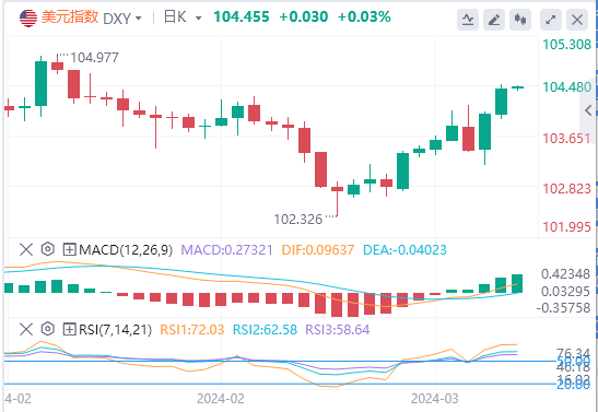 美元指数:截止发稿,美元指数交投于104.455附近。投资者的注意力现在转移到下周末公布的另一个美国通胀数据上,这次是个人消费支出(PCE)数据。这些数据将与其他一些重要的基本面数据一起公布,包括第四季度国内生产总值(GDP)增长率的再次修正、耐用品订单、按照惯例将公布的美国上周初请失业金人数和密歇根消费者信心指数终值。技术面上,日线图显示,2 月 14 日录得的 2024 年高位 104.97 附近即将出现阻力区域。若美元指数突破该水平,11 月 10 日创下的周线最高点 106.00 和 11 月 1 日创下的 11 月最高点 107.11 将构成阻力。