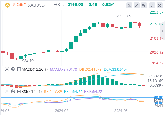 周一亚盘,黄金交投于2165.90附近。上周,美联储在3月会议后连续第五次会议将基准利率维持在5.25%至5.50%的区间不变。美联储主席杰罗姆·鲍威尔(Jerome Powell)暗示,美联储有望在2024年降息三次,这推动了投资者对贵金属的更多需求,并提振了金价。根据CME FedWatch工具,投资者预计美联储将在6月会议上开始降息的可能性为72%,高于利率决定前的65%。