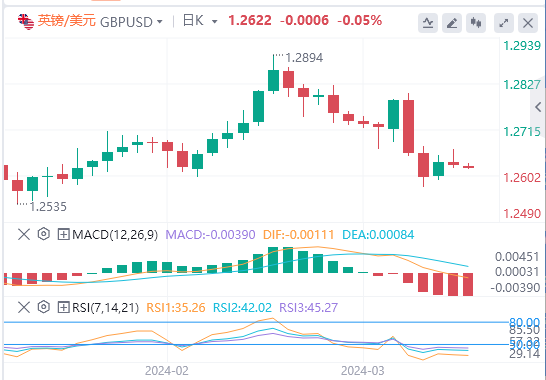 英镑:截止发稿,英镑/美元徘徊于1.2622附近。英镑/美元周二五下跌,收报1.2628,跌幅0.07%。英镑/美元说关键的100天指数移动均线(EMA)。在通胀之路崎岖不平的情况下,许多联准会(Fed)决策者坚持其降息路线,并预计在2024年降息三次,这可能会对美元造成压力。周四将公布美国和英国的国内生产总值(GDP)数据。技术面上,汇价上行的初步阻力位于1.2657,进一步阻力位于1.2685,关键阻力位于1.2703;汇价下行的初步支撑位于1.2611,进一步支撑位于1.2593,更关键支撑位于1.2565。