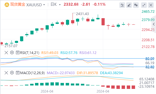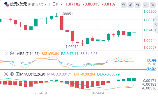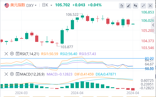 美元指数:截止发稿,美元指数交投于105.702附近。市场对美联储后续会议的预期是,6月降息的可能性为10%,7月降息的可能性为35%,9月降息的可能性低于80%。美国国债收益率下降,表明美元环境不利。具体而言,2年期国债收益率为4.97%,5年期国债收益率为4.65%,10年期国债收益率为4.63%。技术面上,日线图上的指标反映了美元指数的喜忧参半。相对强弱指数(RSI)尽管呈负斜率,但仍处于正值区域,表明买家具有弹性。然而,这种看涨势头似乎受到了一些挑战,移动平均收敛散度(MACD)中新形成的红柱证明了这一点,这种方位通常预示着可能转向看跌区域。