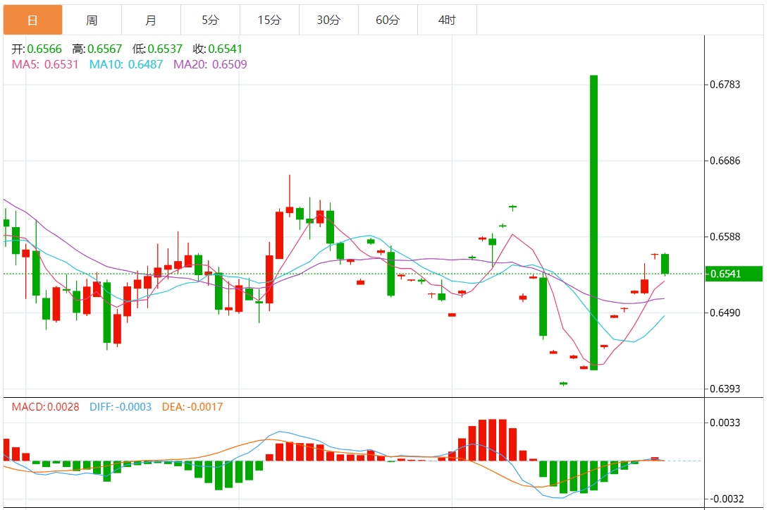 从日线技术图形来观察,澳元已有效穿越了布林带通道中轨线之上,各项技术指标均呈上摆,显示澳元多头开始活跃,进一步上行的目标将会是此前宽幅横盘震荡的上沿区域0.6616-0.6645。下方的支撑落在宽幅震荡区的下沿0.65附近。