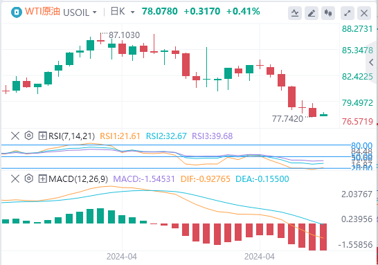 周一亚盘,原油交投于78.07附近。油价已降至近三个月来的最低水平,美国西德克萨斯中质原油(WTI)和布伦特原油均大幅下跌。这种低迷反映了供应增加、需求疲软和具有挑战性的经济指标的混合,所有这些都导致了对近期前景的看跌。