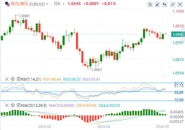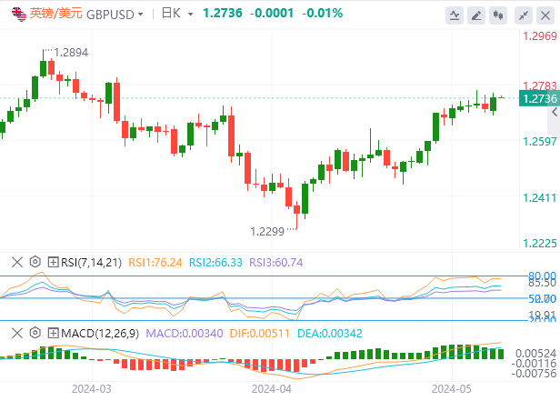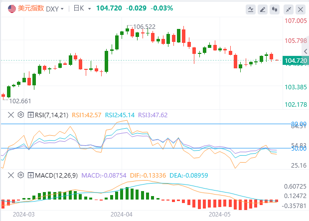美元指数:截止发稿,美元指数交投于104.720附近。随着美国经济显示出强劲的指标,美联储(Fed)对过早宽松的谨慎立场将限制任何下行趋势。本周,美联储首选的通胀指标——4月个人消费支出(PCE)将公布,并可能改变央行信息的立场。技术面上,美元指数最近的支撑位在104.40-104.60区间。跌破104.40将为测试支撑位103.75-103.90开辟道路。