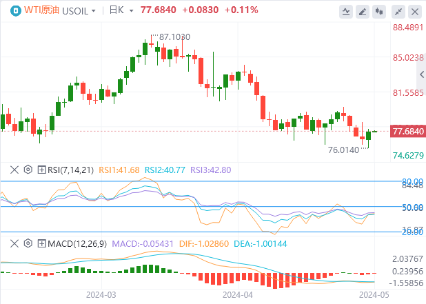 周一亚盘,原油交投于77.68附近。根原油(WTI)价格小幅上涨,原因是整体市场风险偏好回升,这可能是由于投资者对美联储9月降息的预期。周一亚洲时段,WTI原油价格在每桶77.70美元左右交易。上周五,密歇根大学5月份5年期消费者通胀预期小幅回落至3.0%,低于预期的3.1%。通胀预期的下降提振了投资者对美联储可能降息的情绪。