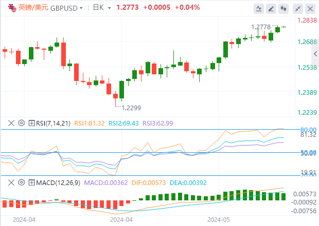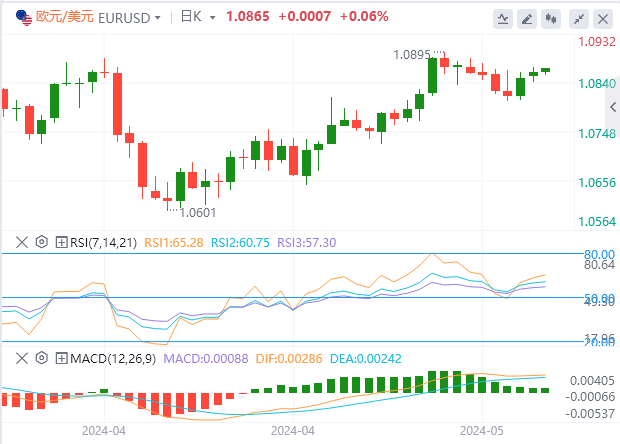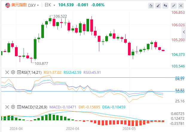 美元指数:截止发稿,美元指数交投于104.593附近。随着美国经济显示出强劲的指标,美联储(Fed)对过早宽松的谨慎立场将限制任何下行趋势。本周,美联储首选的通胀指标——4月个人消费支出(PCE)将公布,并可能改变央行信息的立场。技术面上,如果美元指数收于支撑位104.40-104.60下方,它将走向下一个支撑位,即103.75-103.90区间。