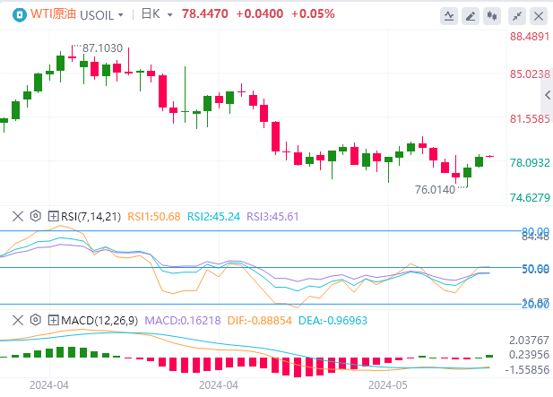 周二亚盘,原油交投于78.44附近。本周稍晚将更新美国个人消费支出(PCE)通胀数据,这将为观望美联储降息的投资者提供一个关键指标。市场预计周五公布的4月美国PCE价格指数年率将维持在2.8%。欧佩克+组织普遍预计将维持最初于2023年通过的自愿产量上限,以支撑全球原油价格。由于美国产量持续上升并超过需求,欧佩克+组织可能会维持产量限制,以试图消化过剩的产量。欧佩克+会议定于6月2日召开。