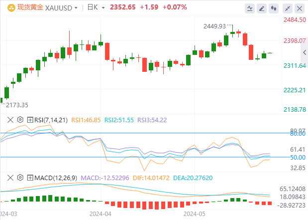 周二亚盘,黄金交投于2352.65附近。美元持续疲弱,反弹乏力的原因是投资者一直认为美联储即将召开的两次会议上不会降息。由于美国阵亡将士纪念日放假,当地市场休市,经济复苏停滞不前。接下来的几天里,美国经济事件较为清淡,焦点将转移到周五,届时美国将公布4月美国PCE价格指数,这是美联储最看重的通胀指标。预计美国PCE价格指数年率为2.7%,而核心核心PCE价格指数年率预期2.8%,与3月指标持平。最后,预计美国PCE价格指数月率上升0.3%。一般来说,若通胀低于预期,应会提高即将加息的几率,而若通胀高于预期,会被视为货币紧缩政策将推迟至9月以后。