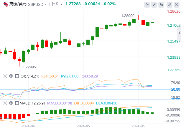 英镑:截止发稿,英镑/美元徘徊于1.2728附近。英镑/美元周四上涨,收报1.2731,涨幅0.25%。英国央行将从8月会议开始降息的预期可能会打压英镑。尽管如此,由于英国4月消费者价格指数(CPI)报告显示,价格压力缓解的速度慢于预期,投资者降低了对6月降息的押注。技术面上,突破1.2750水平将为测试最近的阻力位1.2780 – 1.2800开辟道路。