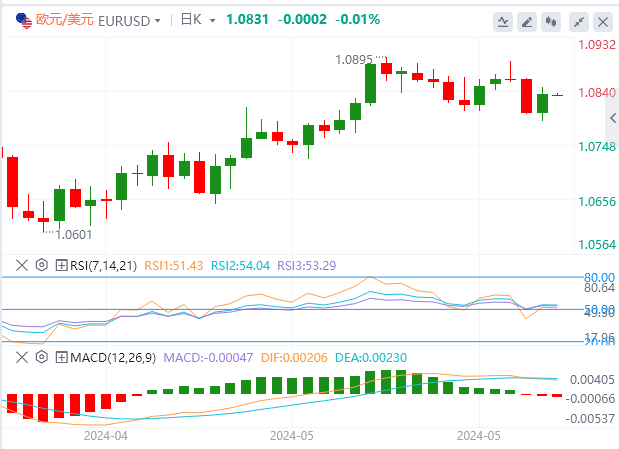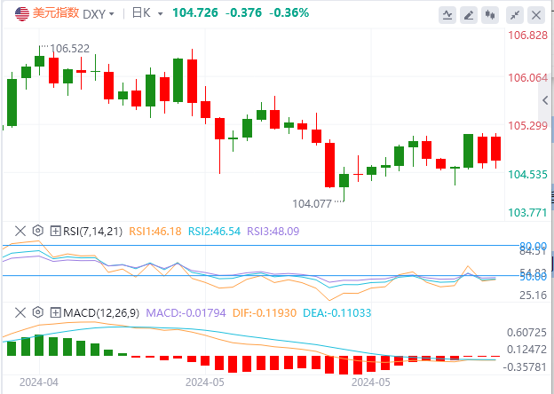 美元指数:截止发稿,美元指数交投于104.72附近。美元指数周四走低,扭转了早些时候的涨幅。受弱于预期的经济数据、美国国债收益率回落以及周五PCE通胀报告前头寸平仓的影响,该指数在未能突破50日移动均线后难以保持势头。在持续的通胀压力下,对美联储降息的预期已经下调。交易员目前正在密切关注周五公布的个人消费支出(PCE)价格指数,这是美联储首选的通胀指标,以寻找货币政策的进一步线索。此外,在本周早些时候德国通胀数据强于预期之后,将于周五公布的欧元区价格数据将提供见解。技术面上,如果美元指数收于支撑位104.40-104.60下方,它将走向下一个支撑位103.75-103.90。