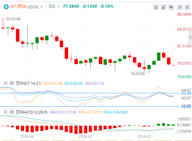 周五亚盘,原油交投于77.56附近。美国石油协会(API)和能源信息署(EIA)均报告称,本周美国原油库存大幅下降,但能源交易商对炼油厂开工率急剧超过需求而导致成品油库存大幅增加表示担忧。美国石油协会报告称,截至5月24日当周,美国每周原油库存减少了-649万桶,能源信息署则指出,同期原油库存变化减少了-415.6万桶。然而,尽管原油供应量大幅减少,但继能源信息署报告称炼油厂原油持有量增加了60.1万桶/日,创下2019年12月以来原油库存最高水平后,油价承压。能源信息署还报告称,炼油厂利用率上升了2.6%。