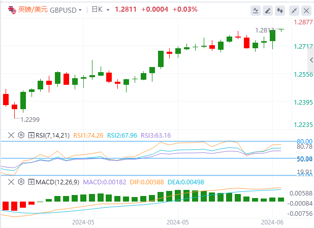 英镑:截止发稿,英镑/美元徘徊于1.2811附近。英镑/美元上周五上涨,收报1.280,涨幅%。市场预计,随着英国4月年度整体通胀大幅放缓,英国央行(BoE)可能会从8月会议开始降息。然而,英国央行政策制定者仍然担心服务业通货紧缩进程的进展放缓。在英国没有发布顶级经济数据的情况下,美元价格动态将继续在本周影响英镑/美元方面发挥关键作用。技术面上,如果英镑/美元成功收于阻力位1.2780-1.2800上方,它将走向下一个阻力位,即1.2875-1.2900区间。