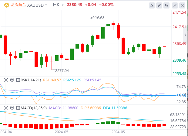 周二亚盘,黄金交投于2350.49附近。美国公布喜忧参半的数据后,美国国债收益率下跌,增加了人们对美联储可能放松政策的希望,金价上涨逾0.80%。再加上避险冲动,黄金在触及2,314美元的日低点并交易于2,345美元后继续攀升。上周,美联储首选的通胀指标——美国核心个人消费支出价格指数(PCE)企稳,增强了降息的希望。与此同时,根据标准普尔全球(S&PGlobal)和供应管理协会(ISM)5月份的报告,商业活动喜忧参半,后者连续第二个月萎缩。