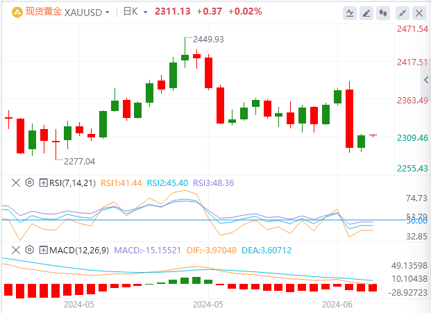 周二亚盘,黄金交投于2311.13附近。美国劳工统计局(BLS)公布的就业数据弱于预期,使美国国债收益率几乎保持不变,黄金周四触及两周高点2,378美元,这对黄金有利。美国就业数据是当天的主要驱动因素之一,此前美国劳工统计局透露,申请失业救济金的美国人数量超过了市场预期和前一周的读数。此外,欧洲央行(ECB)决定降息,这导致美国国债收益率攀升,随后回吐了早些时候的涨幅。