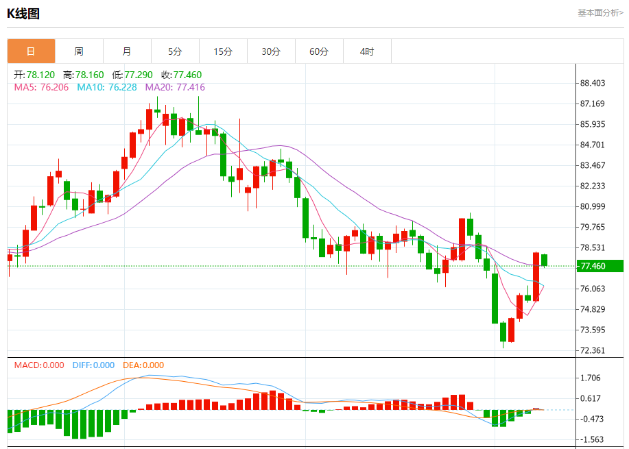 原油市场:截止北京时间20:26,美油下跌,现报77.420,跌幅0.40%。纽市盘前,原油价格稳定在77.64美元,我们仍然保持中立,直到价格根据上述水平确认其情况,以明确检测其下一个目的地,因为它面临着技术因素之间的矛盾。