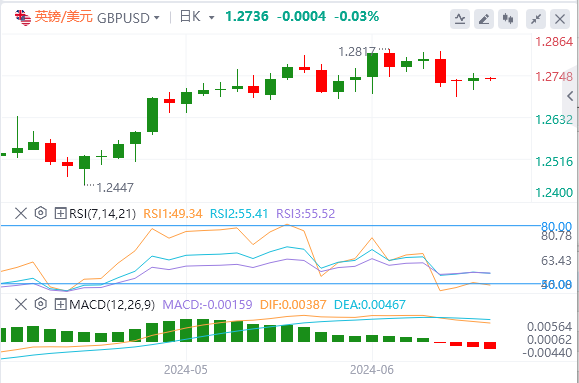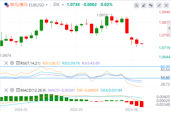 欧元:截止发稿,欧元/美元徘徊于1.0738附近。欧元/美元周二下跌,收报1.0740,跌幅0.23%。欧元/美元周二连续第三次下跌,因欧盟议会选举动荡导致市场情绪恶化。在选举中,欧洲选民坚定地支持中右翼和极右翼政党,而左倾政党则大幅失利,因为欧盟公民对欧洲老牌执政党的经济脆弱性和当前政策策略表示不满。技术面上,需要注意的是,RSI处于超卖区域,因此反弹的风险正在增加。