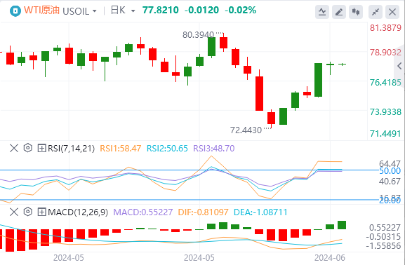 周三亚盘,原油交投于77.82附近。尽管投资者情绪在美联储周三的关键会议前走低,但原油市场在美国石油协会(API)报告本周原油库存减少幅度超过预期后保持稳定。截至 6 月 7 日当周,美国石油协会原油库存减少 -242.8 万桶,比预期的减少-175 万桶规模还要大,并有助于削减上周增加的 405.2 万桶库存。