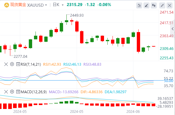 周三亚盘,黄金交投于2315.29附近。美联储正在召开为期两天的会议,并将于周三公布会议结果,投资者正等待美国决策者的消息。市场普遍预期美联储将把联邦基金利率维持在目前的 5.25%-5.50% 之间,最早也要到 9 月份才会降息。今年第一季度通胀小幅走高,而劳动力市场依然紧张,这促使美联储(FED)维持鹰派立场。