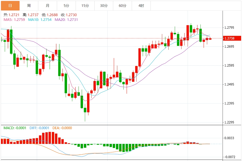 技术上,英镑/美元可能会上涨,因为技术分析表明该货币对看涨。此外,移动平均收敛散度 (MACD) 动量指标加强了看涨趋势。MACD 线位于中心线上方,并在信号线上方发散,表明进一步向上移动。阻力位方面,心理水平1.2800构成重大障碍。突破该水平可能会推动英镑/美元货币对测试1.3000附近的上升通道的上边界。不利的一面是,位于1.2715的21日指数移动平均线(EMA)的初步支撑位很明显,进一步的支撑位在上升通道的下边界1.2700附近。如果英镑/美元货币对突破该水平,它可能会遇到额外的压力,可能会测试回落支撑位1.2450附近。