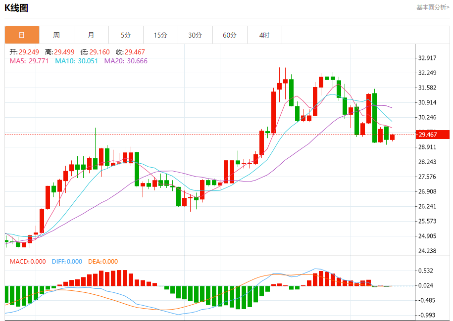 现货白银:截止北京时间20:21,现货白银上涨,现报29.480,涨幅0.82%。纽市盘前,白银价格显示出看跌倾向,现在测试29.30美元水平,等待再次交易低于该水平,以恢复今天预期的看跌趋势,其下一个主要目标位于28.55美元。