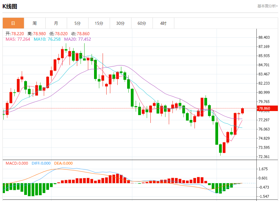 原油市场:截止北京时间20:21,美油上涨,现报78.860,涨幅1.25%。纽市盘前,原油价格持续上涨,接近79.00美元关口,强化了今天继续看涨趋势的预期,实现我们期待的79.55美元目标的道路是开放的,提醒您超过这一水平将推动价格实现额外的收益,达到81.50美元,而看涨趋势将保持有效和活跃,除非突破77.64美元并保持在其下方。