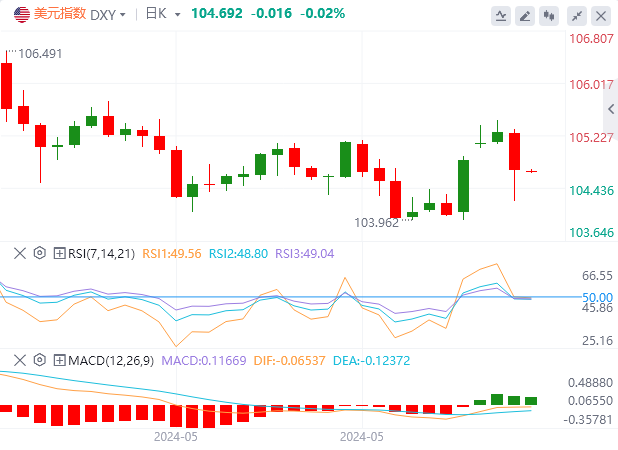 6月13日,北京时间周四亚市早盘,美元指数徘徊在104.46附近。周三,因美国5月CPI数据低于预期,美元指数大幅跳水,后因美联储最新利率预测放出鹰派信号而有所回升,最终收跌0.56%,报104.67。10年期美债收益率最终收报4.3230%。对美联储政策利率最敏感的2年期美债收益率最终收报4.7600%。受美国CPI报告意外疲软提振,现货黄金连续第三个交易日上涨,一度触及2340大关,最终收涨0.27%,报2322.50美元/盎司。现货白银最终收涨1.52%,报29.70美元/盎司。因中东地区紧张局势持续带来支撑,国际油价上涨。WTI原油最终收涨0.16%,报78.24美元/桶;布伦特原油收涨0.43%,报82.48美元/桶。