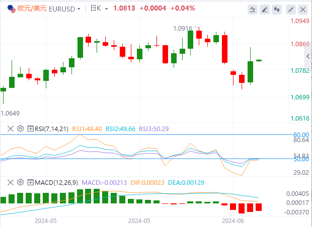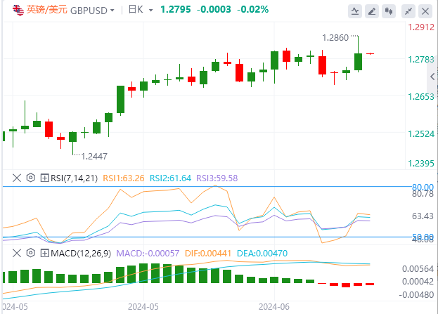 英镑:截止发稿,英镑/美元徘徊于1.2795附近。英镑/美元周三上涨,收报1.2798,涨幅0.46%。根据英国国家统计局(ONS)周三公布的快速数据,英国经济增长在4月份停滞不前。英国国内生产总值(GDP)继3月增长0.4%后,4月为0%,符合市场共识。英国央行(BoE)将于6月20日召开会议,讨论其货币政策的下一步行动。投资者认为6月降息的可能性很小,并将预期转向8月或9月。技术面上,RSI最近已进入超买区域,因此回调的风险正在增加。