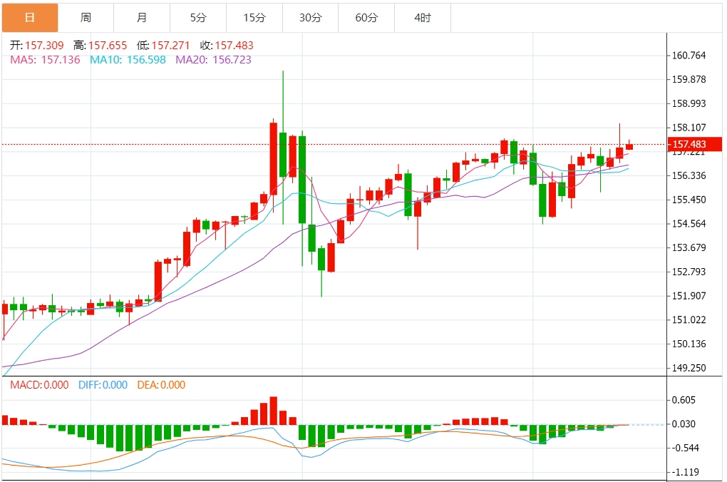 技术层面上,日线级别图上,美元/日元再度回到布林带通道中轨线之上,技术指标处在均衡线附近指向性不太明朗。目前上方158.00构成较重的压力,如果突破,美元/日元有望走高一线。目前下方的强支撑仍然保持在155.00附近。