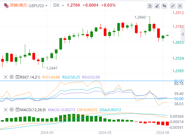 英镑:截止发稿,英镑/美元徘徊于1.2708附近。英镑/美元上周五下跌,收报1.2704,涨幅0.15%。英国CPI通胀将于周三公布,预计5月环比将升至0.4%,高于上个月的0.3%。英国央行(BoE)也聚集在一起,就利率进行新的投票。市场普遍预计英国央行将在6月份将利率维持在5.25%,货币政策委员会(MPC)预计将以7比2的投票结果维持利率不变,与英国央行上次会议一致。技术面上,突破1.2700水平将为测试50MA1.2748开辟道路。如果英镑/美元攀升至50日均线上方,它将走向阻力位1.2780–1.2800。