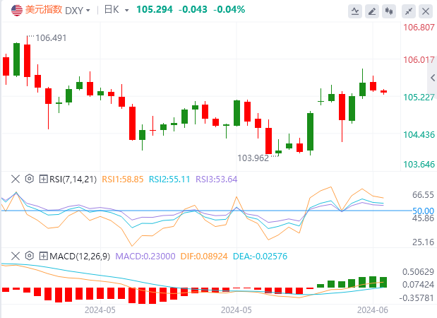 6月18日,北京时间周二亚市早盘,美元指数徘徊在105.29附近。周一,美元指数在美盘时段有所走低,但依旧维持在近一个月来的高点附近,最终收跌0.16%,报105.33。10年期美债收益率有所回升,最终收报4.286%。对美联储政策利率最敏感的2年期美债收益率最终收报4.774%。由于数位美联储官员坚守年内仅降息一次的预期,现货黄金有所回调,盘中一度跌近2310美元关口,最终收跌0.59%,报2318.58美元/盎司。现货白银最终收跌0.32%,报29.44美元/盎司。因投资者对需求前景愈发乐观,国际油价延续涨势,并创近一个月以来新高。WTI原油一度逼近80美元大关,但并未站上此处,最终收涨2.39%,报79.91美元/桶;布伦特原油收涨2.15%,报83.97美元/桶。美、布两油期货结算价收涨约2%,前者一个月来首次站上80美元大关。
