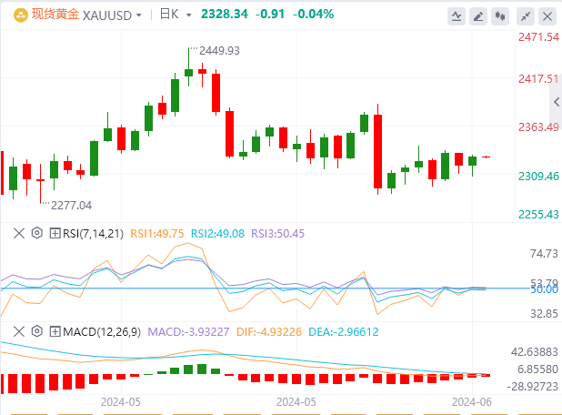 周三亚盘,黄金交投于2328.34附近。喜忧参半的消息几乎没有改变美国投资者普遍乐观的情绪。华尔街周一收盘飘绿,周二美国股指保持良好态势,道琼斯工业平均指数和标普500指数延续周涨势。相反,纳斯达克综合指数下跌了16点。因此,美元兑大多数主要对手货币近期承压。